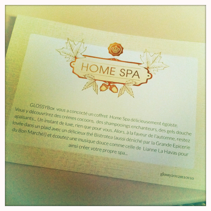 Comme vous le savez, tous les mois depuis quelques temps maintenant je reçois la Glossy Box. Celle d’octobre, reçue à la fin de celui-ci, était placée sous le signe de la détente avec un nom très prometteur : « Home SPA ».