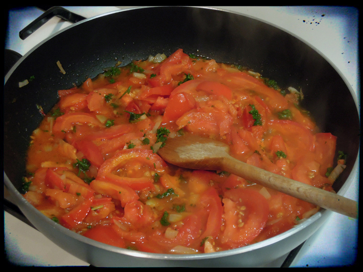 4/ Faites cuire à feu doux pendant 5 à 10 minutes en ajoutant 1/2 verre d’eau si les tomates ne sont pas assez juteuses (je n’ai pas eu besoin de le faire). Laissez réduire en surveillant bien.