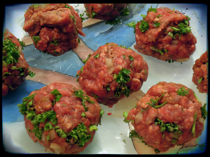 2/ Mélangez la viande hachée, l’oignon et le persil. Ajoutez le Raz el Hanout et 1/2 c.a.s de sel. Formez des petites boulettes de 2cm de diamètre environ, puis réservez au frigo (pour ma part j’ai fait 8 boulettes)
