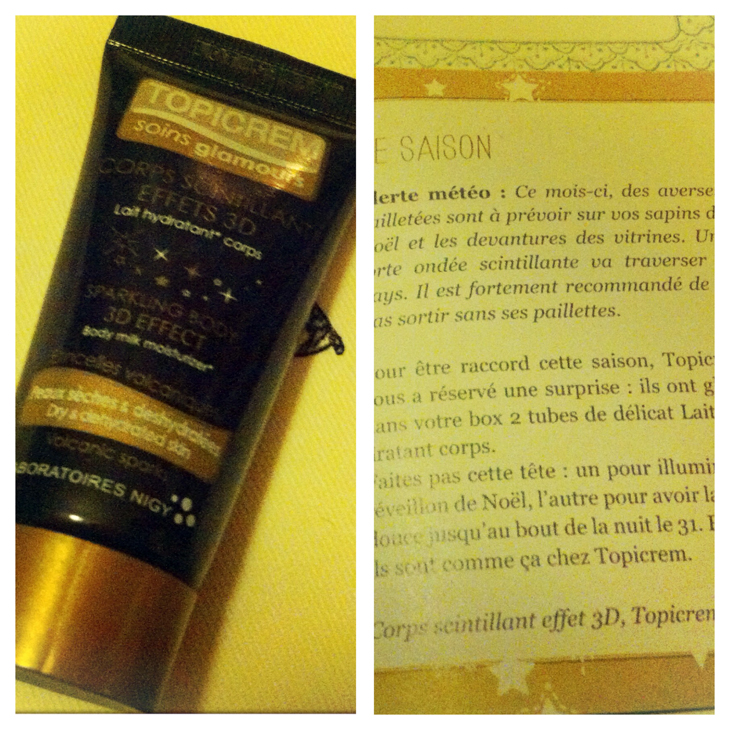 – deux tubes de crème pour le corps scintillant Topicrème (2X 15ml). L’odeur de cette crème est à tomber, l’hydratation pas trop mal et les paillettes super discrètes. (moi qui voulait faire de l’ombre au sapin de Noël cette année, c’est loupé ^_^)