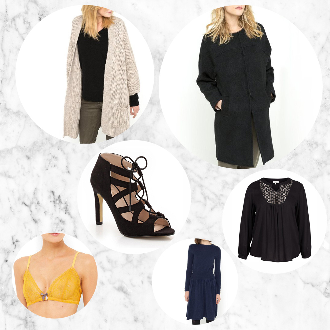 Gilet oversize // Manteau en laine bouillie // Sandales à talons // Blouse en dentelle // Soutien-gorge triangle // Robe en maille