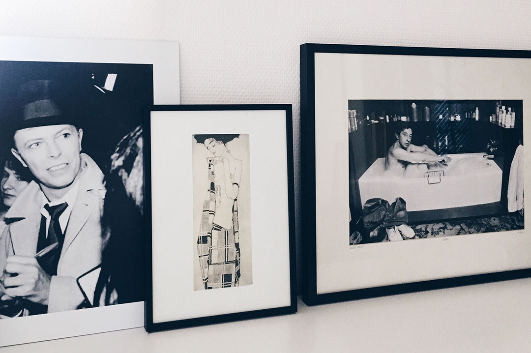 Affiche David Bowie Juniqe *, cadre Egon Schiele, photo de Serge Gainsbourg Yellowkorner, Canapé Made, cache-pot Truffaut, sac en papier Be Poles