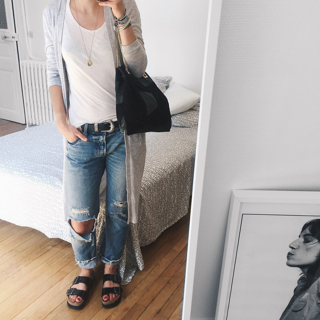 Pour ce qui est du look, c’est finalement toujours un peu la même chose : gilet Minimum, débardeur Mango, jean Levi’s 501 CT, sac River Island * & sandales BT London *.
