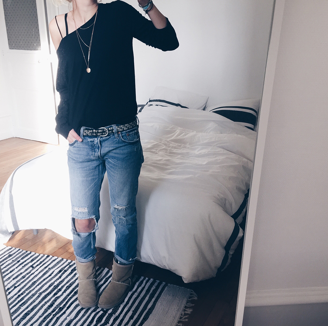 Mais avant d’entamer la nouvelle année, je vais continuer de m’habiller normalement. Et les fringues que j’aime le plus en ce moment (à part mon jogging en maille, vous l’aurez compris) sont ce pull Marie Sixtine, mon indétrônable Levi’s, et mes boots fourrées Roxy.