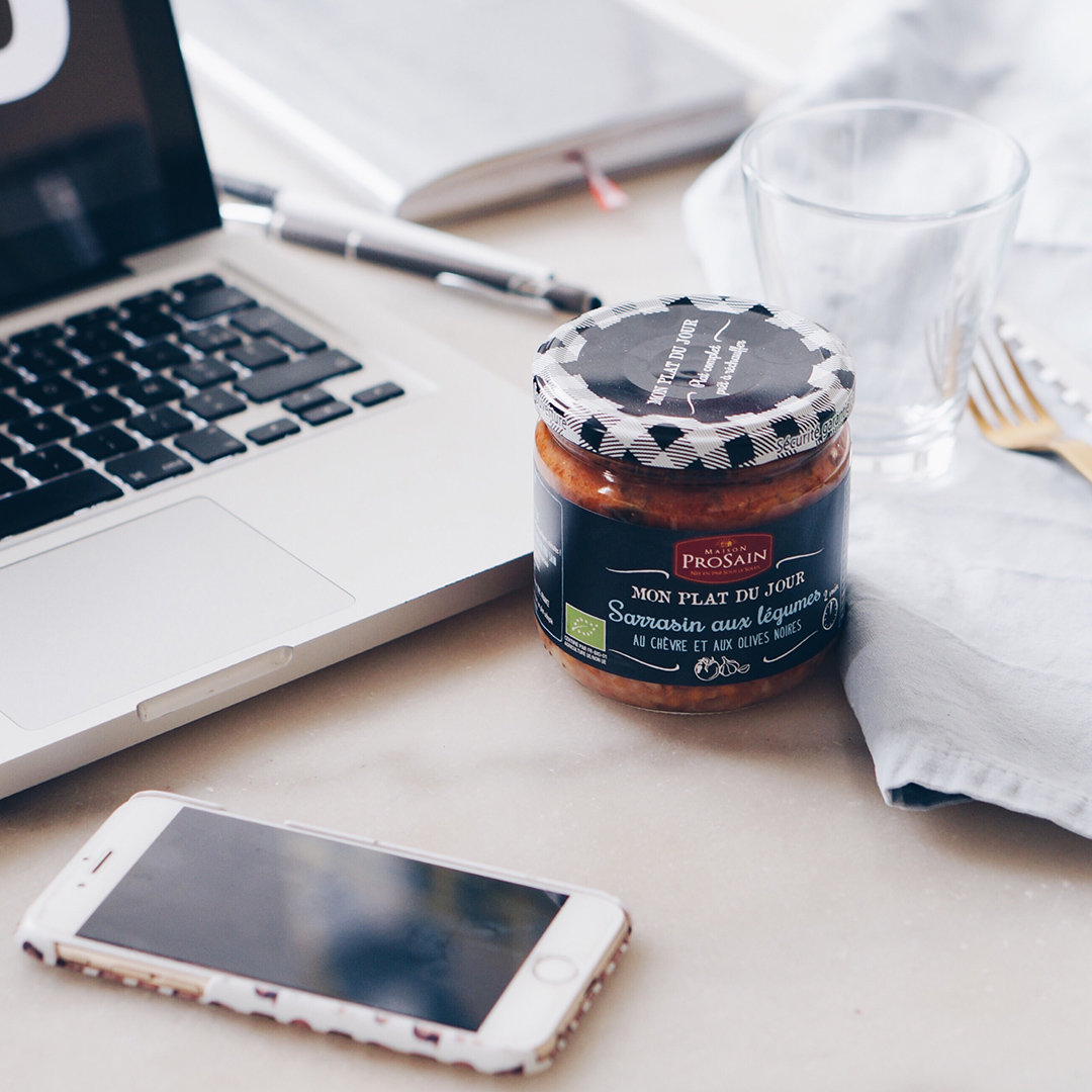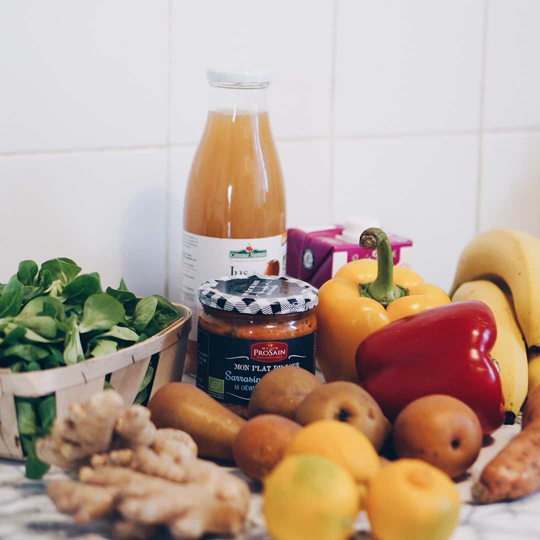 Et notamment ma commande Kerbio * qui, en plus de contenir de délicieux fruits à légumes, avait deux de mes derniers coups de cœur du site : le jus de pomme gingembre et le plat préparé Prosain « Sarrasin de légumes ».