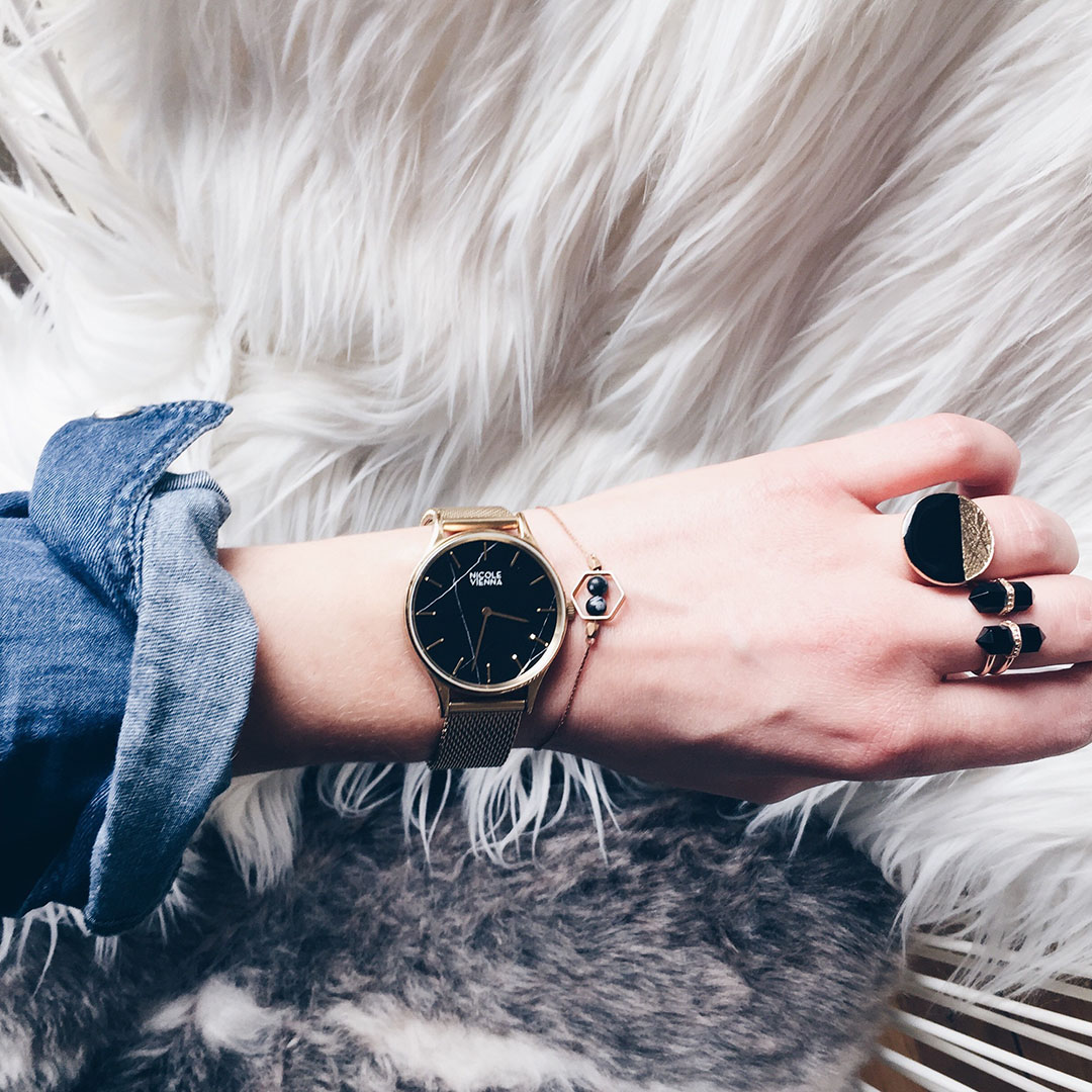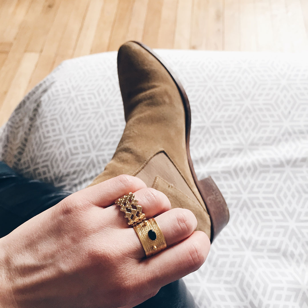 Montre Nicole Vienna *, bracelet Après La Pluie *, bagues : Little Woman Paris via BoxBijoux *, Le Bazar Exquis *, Alexandra Margnat & L’Atelier Clandestin via Emma & Chloé *
