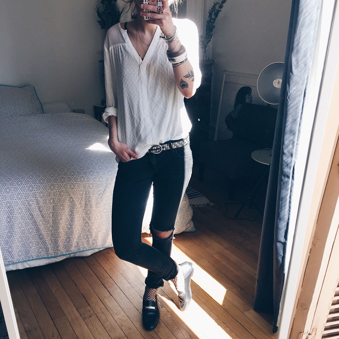 Blouse Grain de Malice *, jean H&M, chaussettes résille, Mocassins Mango