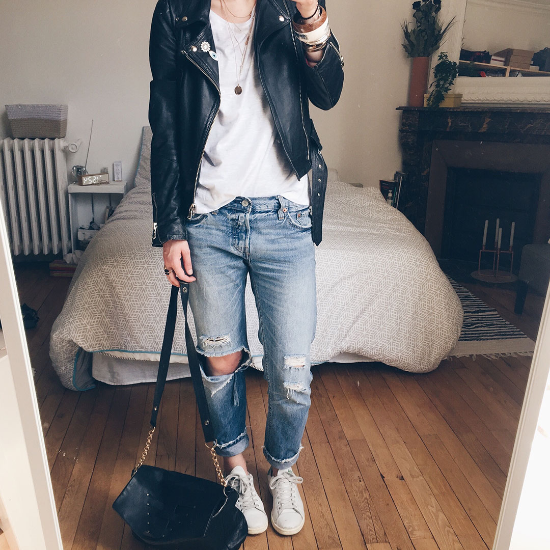 Perfecto Vintage, T-shirt Grain de Malice *, Jean Levi’s, Adidas Stan Smith, Sac Julie Meuriss *
