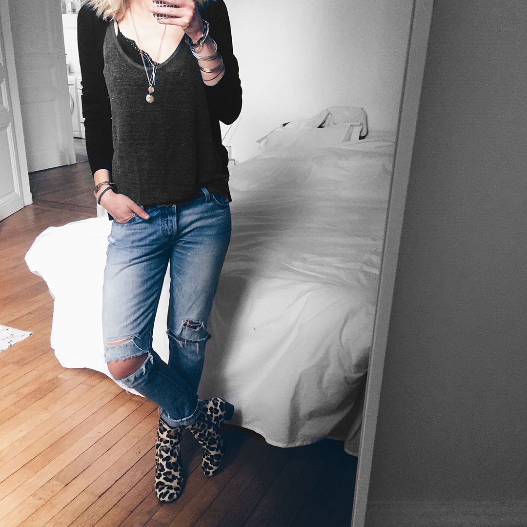 Gilet Kookaï, débardeur Zara, jean Levi’s, boots Boden *