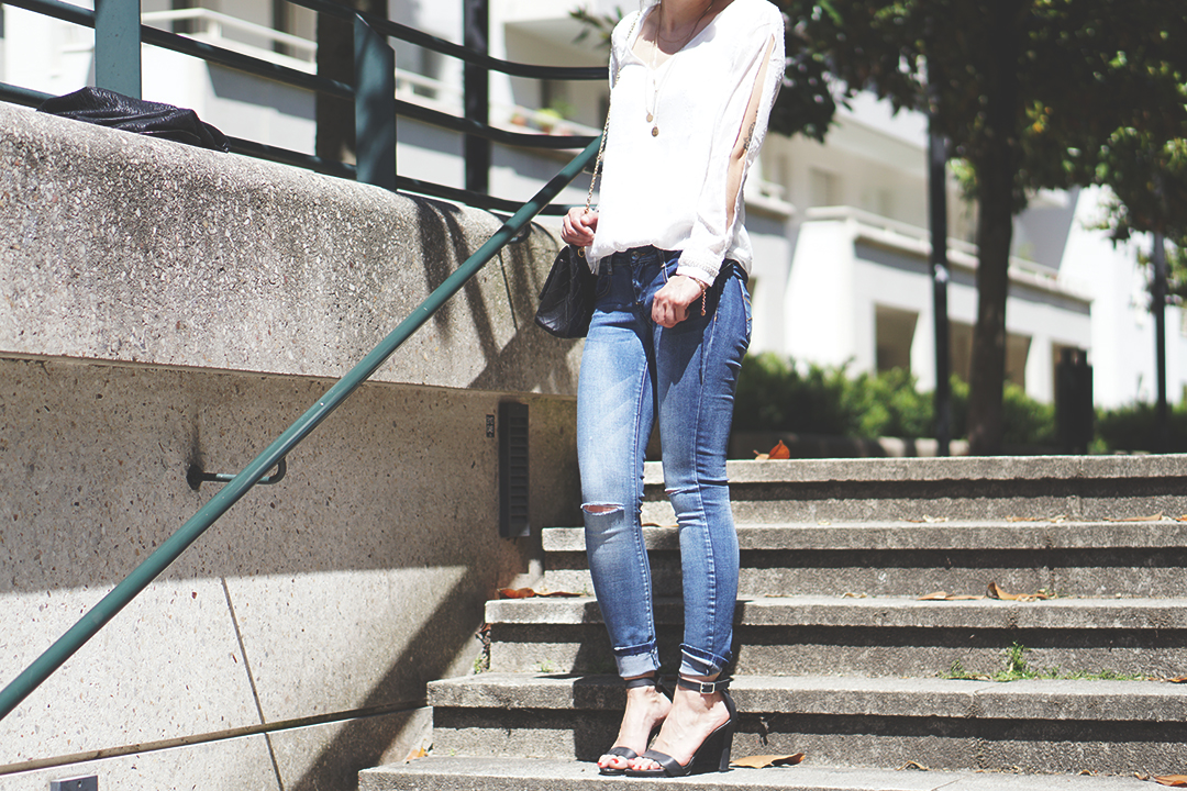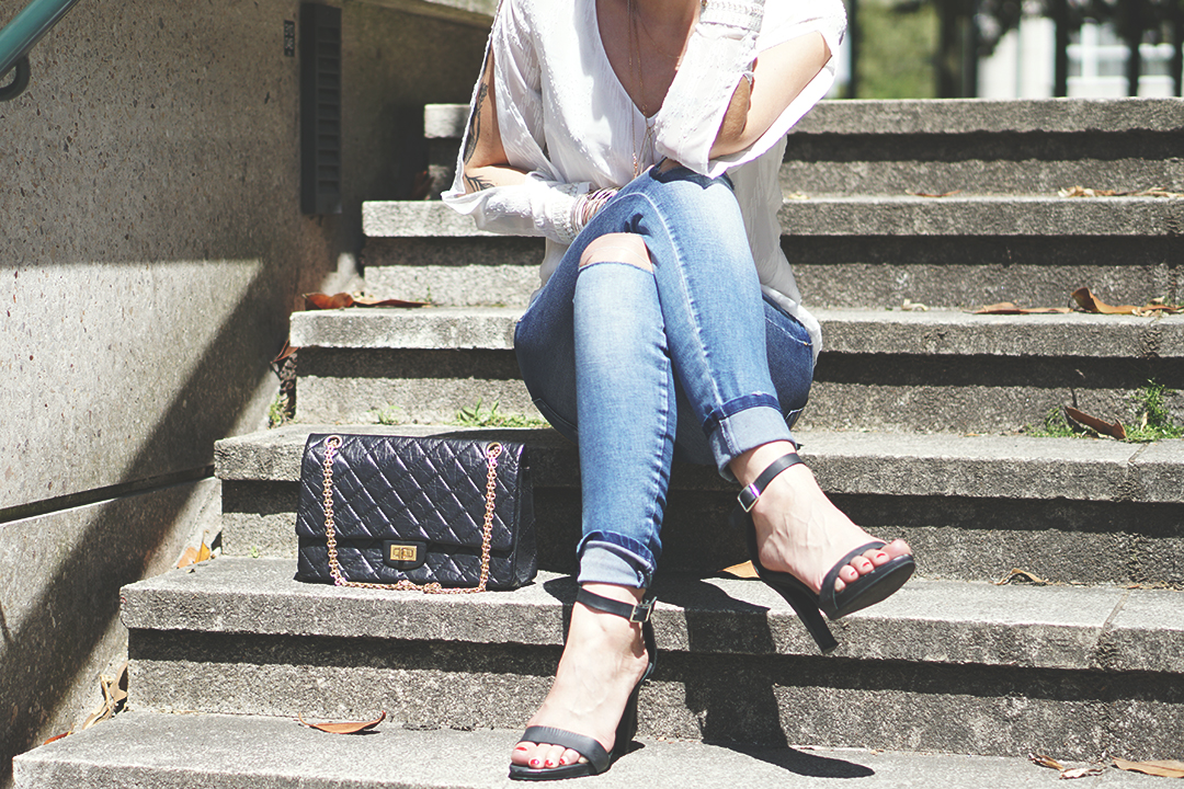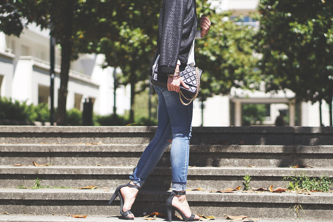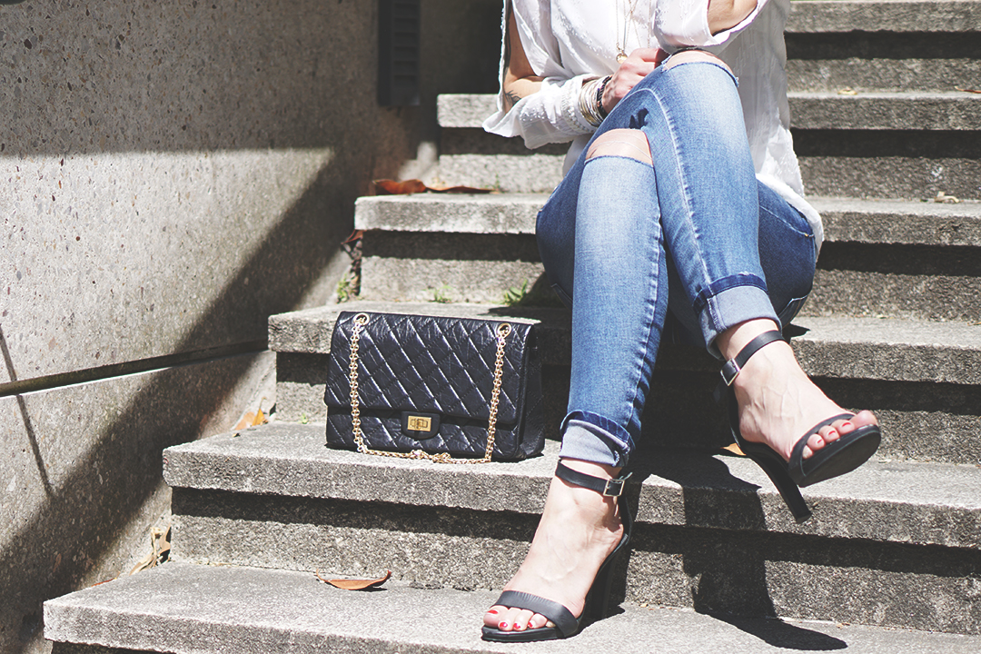 Là, c’est un peu « sapée comme jamais » : sac Chanel et talons hauts ! Mais avec un jean déchiré, faut pas déconner non plus hein. On est pas là pour fouler le tapis rouge de Cannes.