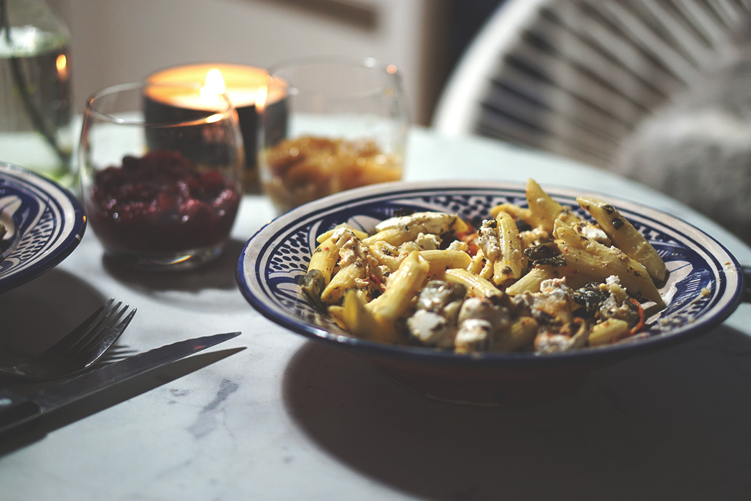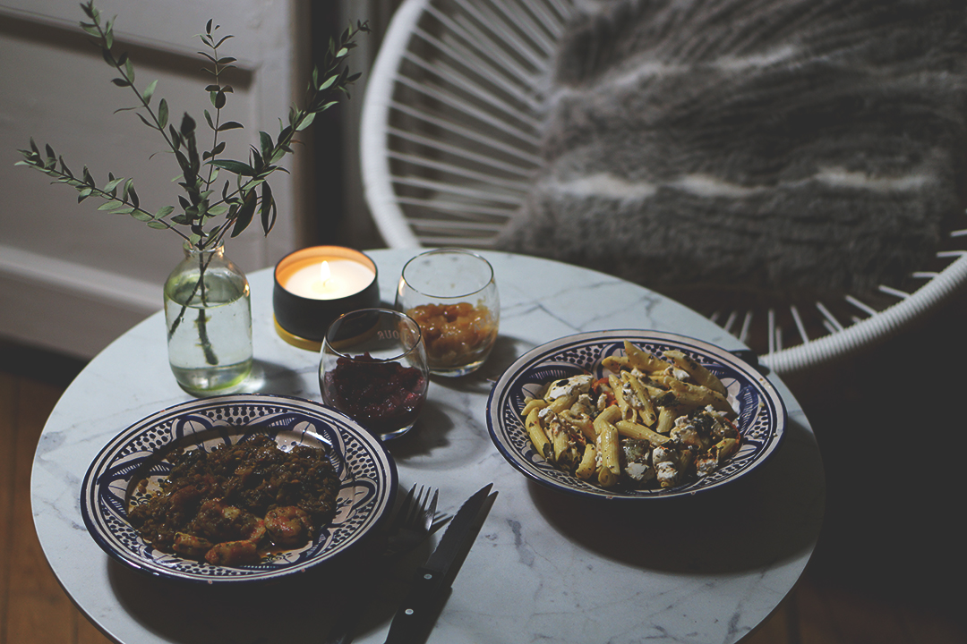 Gambas et dhal de lentilles corail / salade de penne et petits légumes à la méditerranéenne.