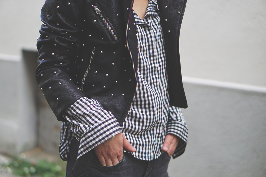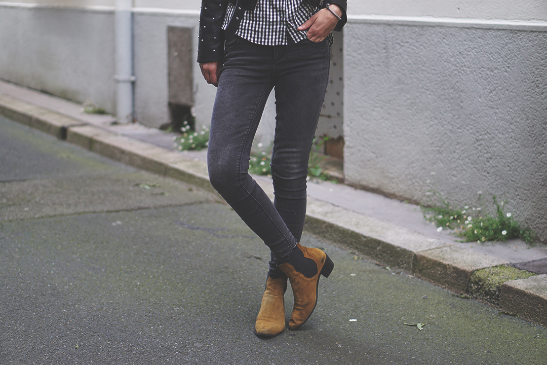 Mon choix s’est porté sur ce jean que je ne quitte plus (c’est un bonheur de confort), cette chemise (dont on parlait hier donc), ce pull (qui n’est pas sur le photos mais que j’aime d’amour) et sur la pièce forte de cette tenue : le perfecto clouté.