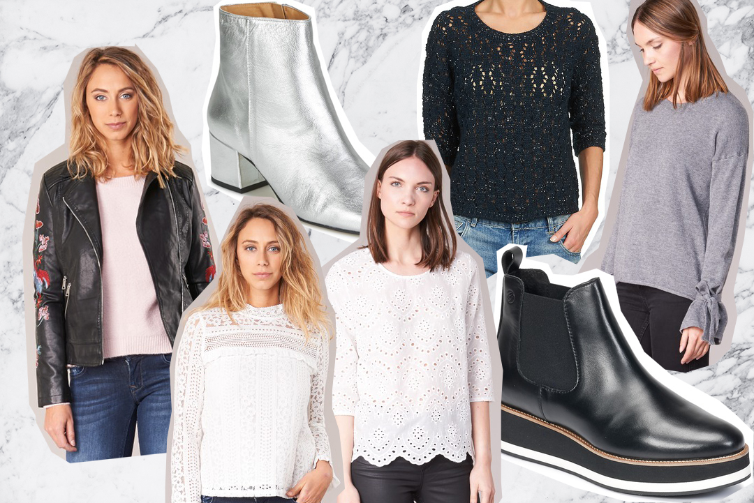 Perfecto en similicuir 49,99€ 25€ // Boots 129€ 103,20€ // Blouse blanche 44,99€ // Blouse blanche 34,99€ 17,50€ // Pull irisé 29,99€ 15€ // Boots à plateforme 99,99€ // Pull gris 34,99€ 20,99€