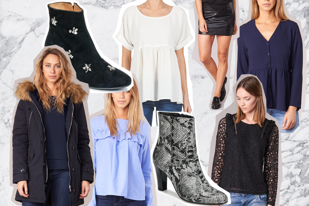 Parka 99,99€ 50€ // Boots noires 139€ 83,40€ // Blouse bleue 29,99€ 17,99€ // T-shirt blanc 34,99€ 20,99€ // Boots serpents 135€ 67,50€ // Jupe similicuir 34,99€ 20,99€ // Blouse noire 34,99€ 17,50€ // Blouse peplum 39,99€