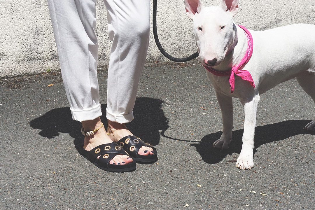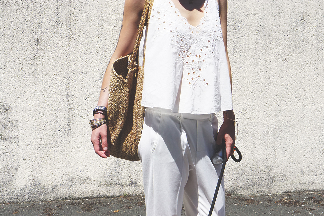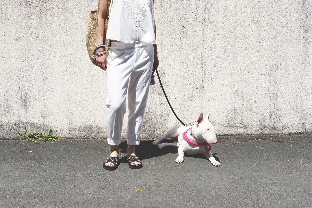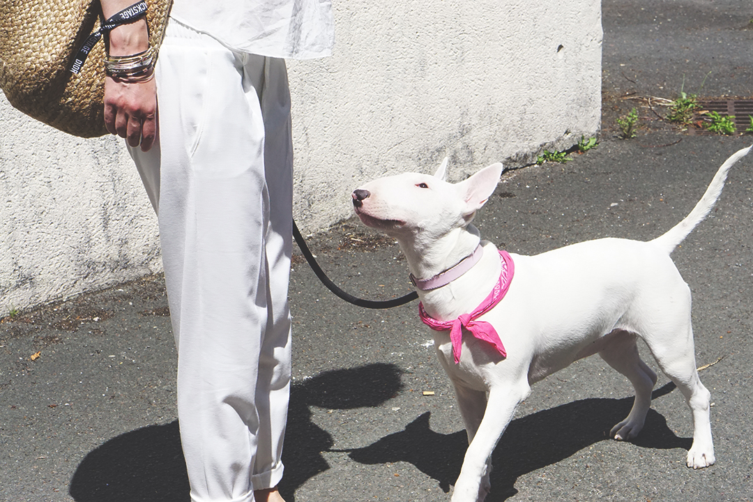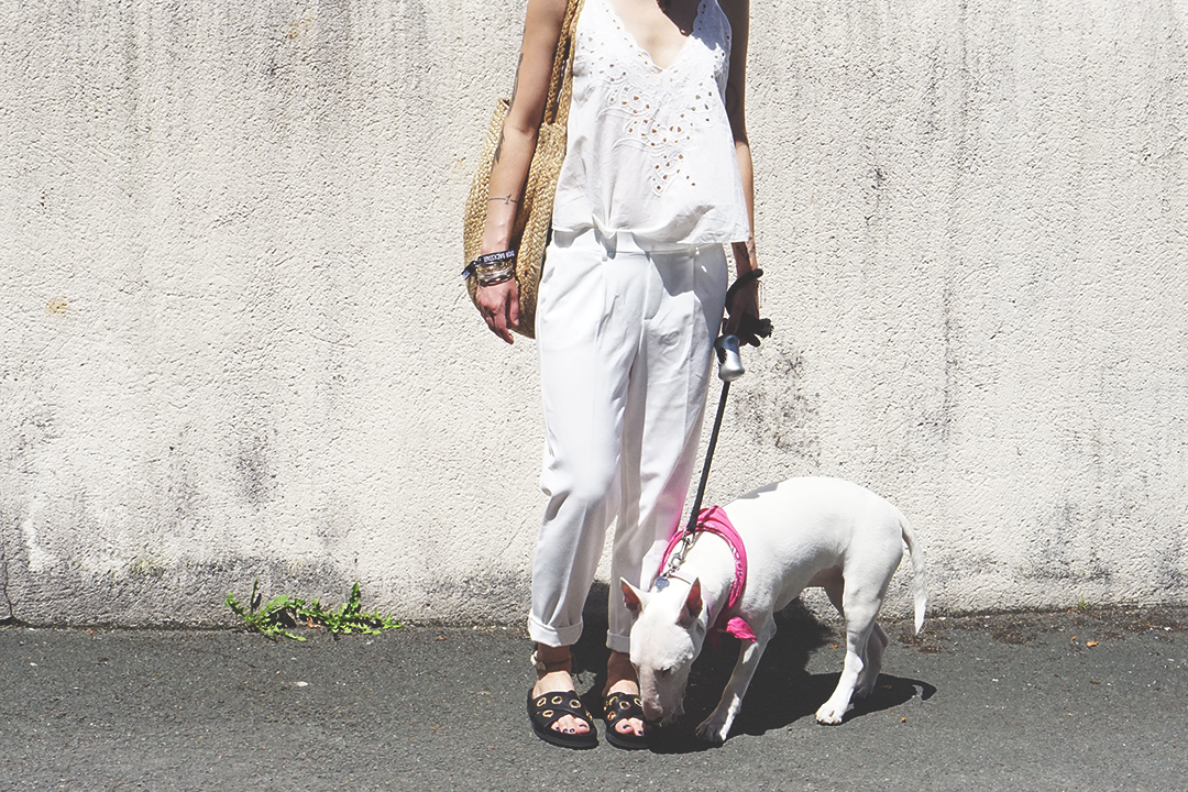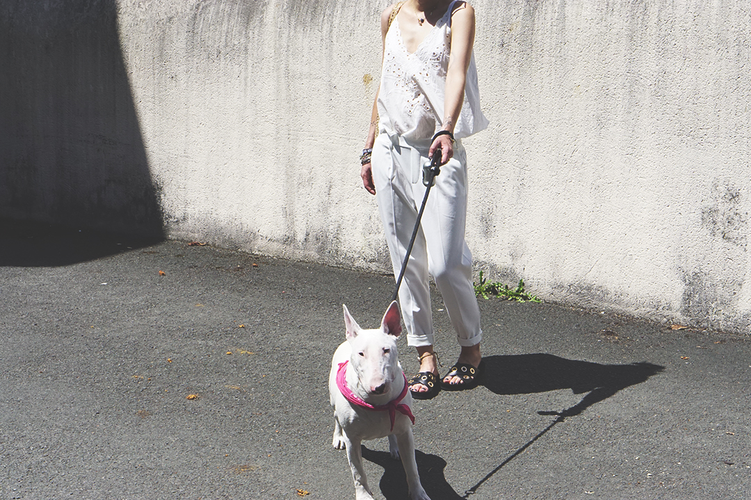 Et si la dernière fois, tout était parfaitement adapté à elle (hormis les talons), il faut bien avouer que ce total look blanc était la moins bonne idée du siècle puisque 5 minutes plus tard, mon pantalon arborait déjà de jolies marques de pattes… Ahem…