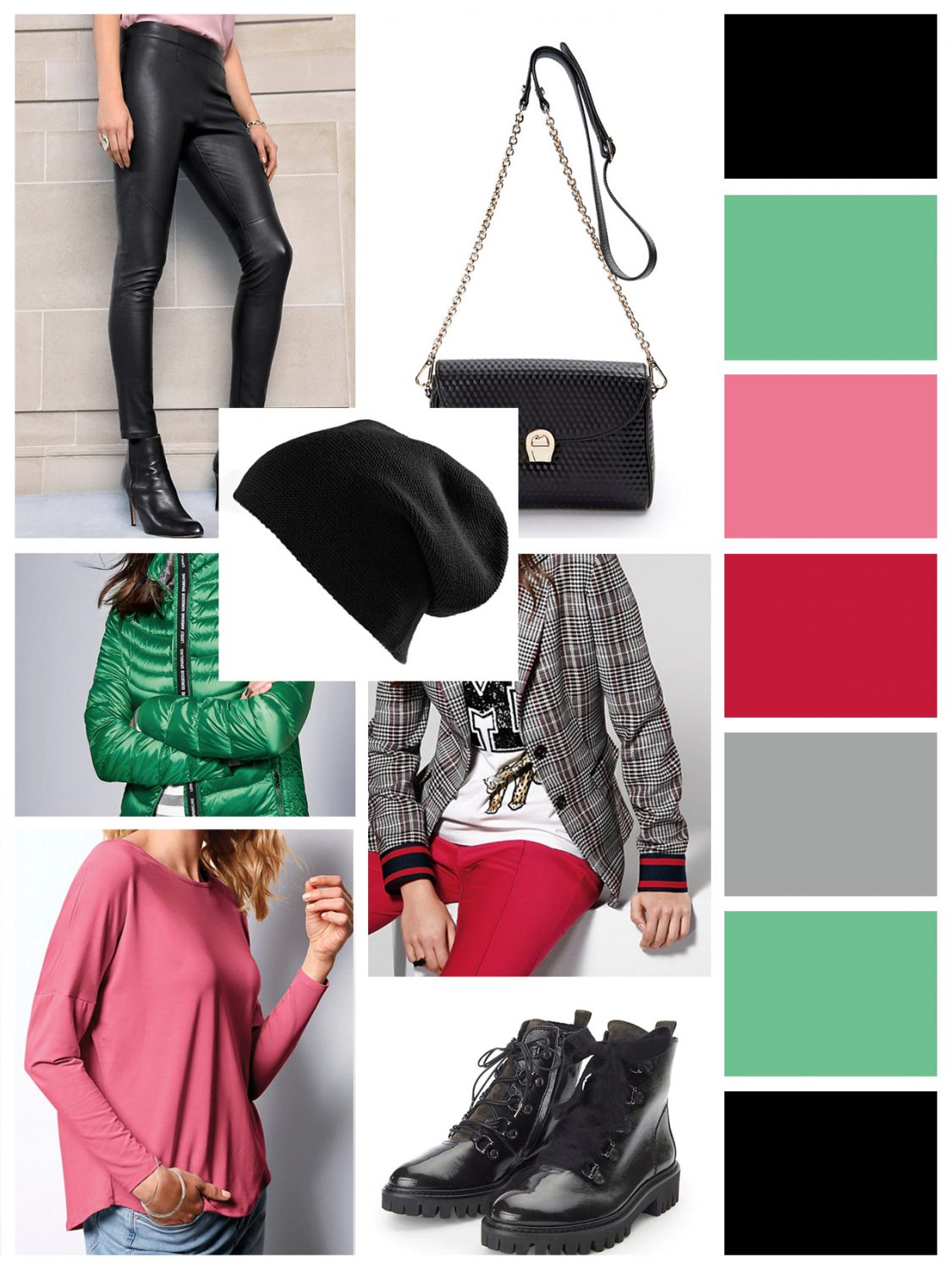 Legging en cuir // Sac // Doudoune verte // Bonnet // Veste // T-shirt rose // Boots