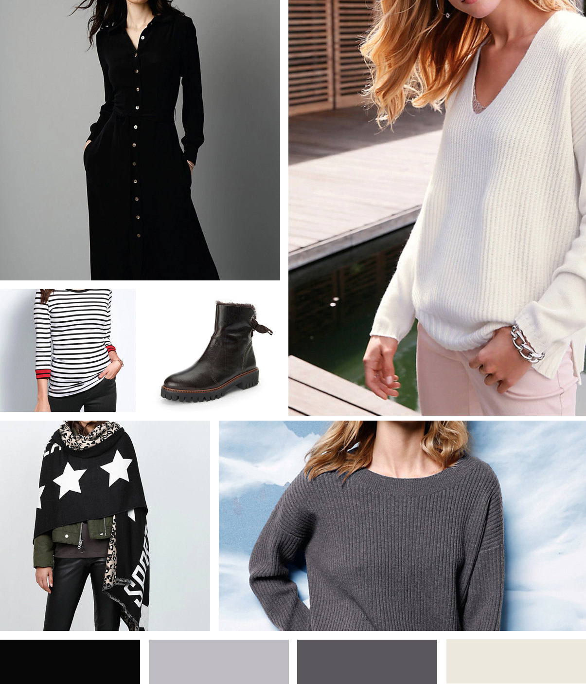 Robe // Pull col V // Marinière // Boots // Écharpe // Pull gris
