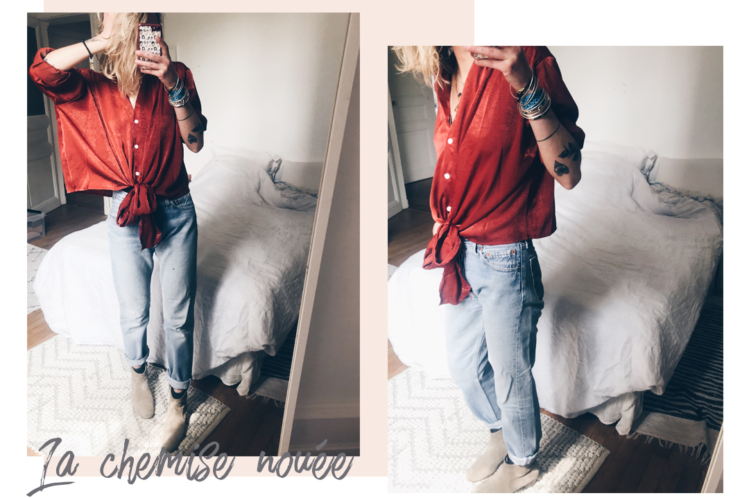 Et on commence aujourd’hui avec ma nouvelle petite chemise nouée parfaite. J’ai déjà hâte de la porter avec un short en jean et des sandales…
