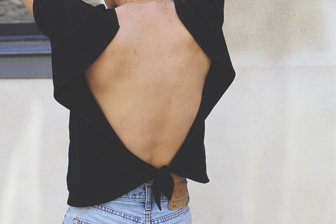 Ce t-shirt est trop beau, il met vraiment en valeur ton dos et ta nuque ! J’aimerais bien en porter un dans ce style, mais j’ai honte des fois de trop dévoiler mon corps.