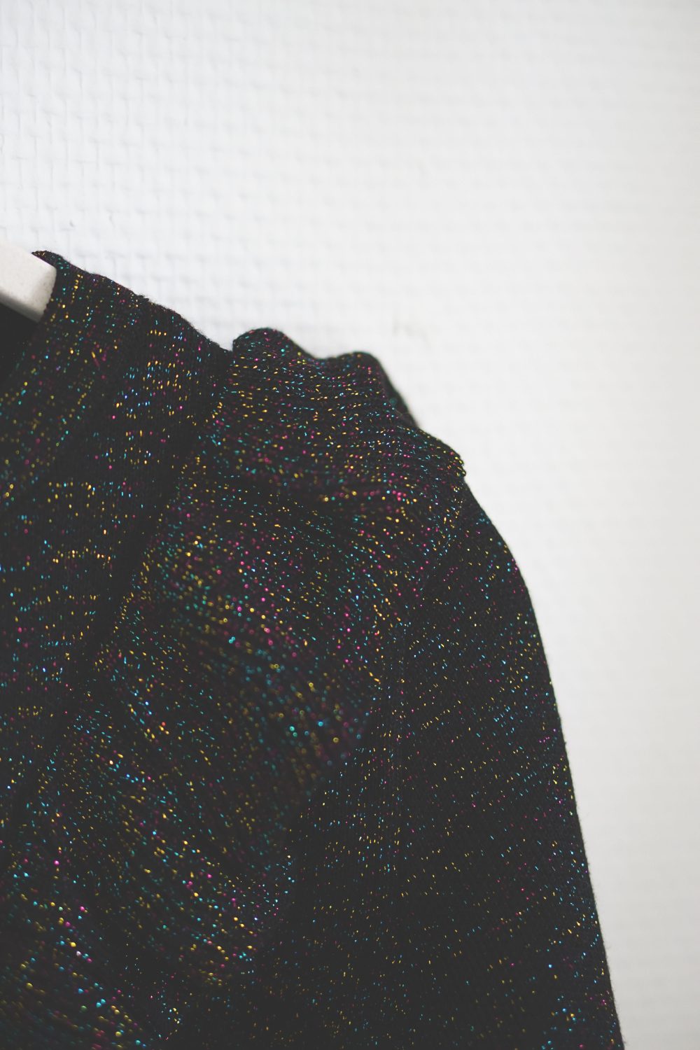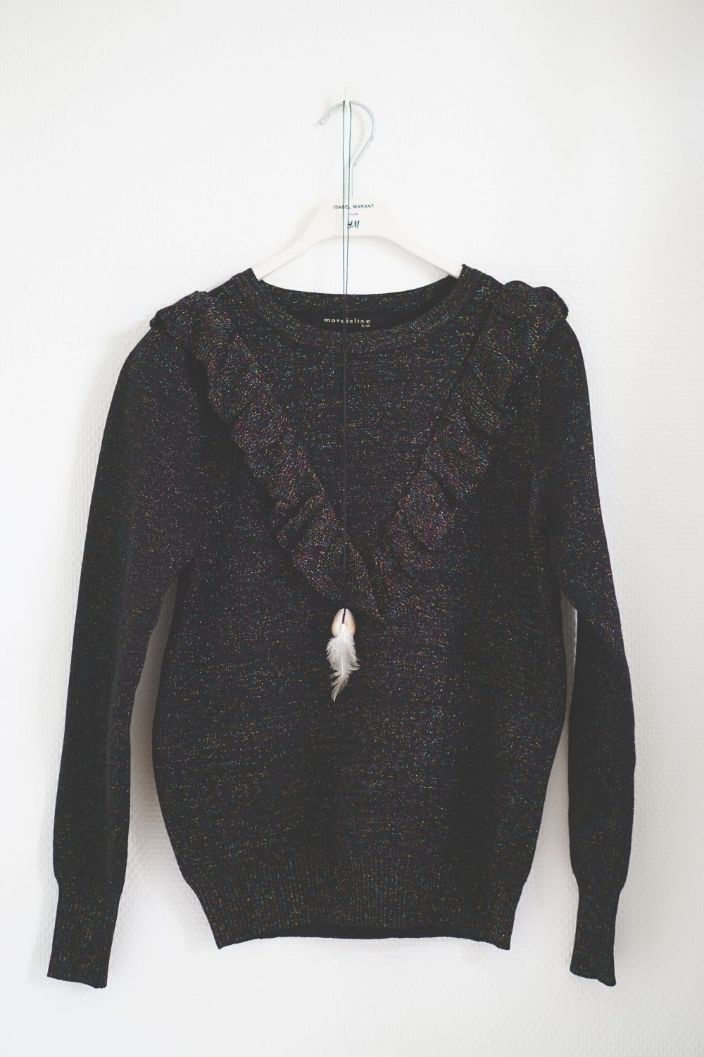 Un joli qui brille de mille feux (et ça, on aime) et un pull court qui est parfait à porter avec une jupe taille haute ! *